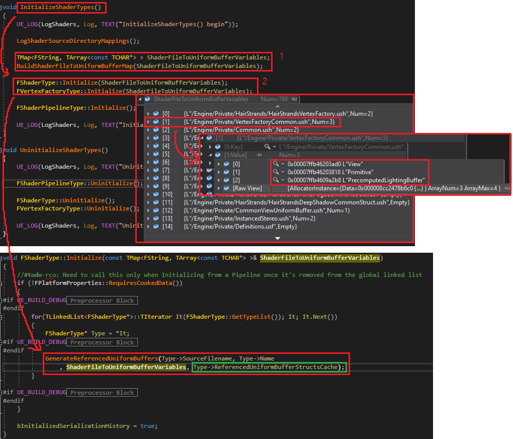 ShaderType, VertexFactoryType의 ReferencedUniformBufferStructsCache를 채우는 과정을 보여줍니다. 엔진이 초기화되는 시점에서 InitializeShaderTypes를 호출하여 모든 ShaderType, VertexFactoryType에 대해서 ReferecedUniformBufferStructsCache를 채웁니다.