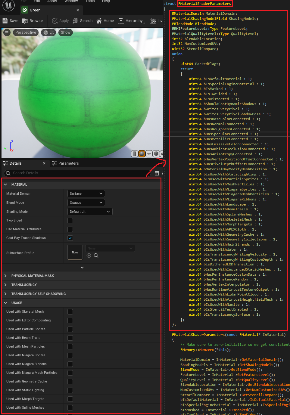 머터리얼 에디터의 디테일 패널에 있는 내용은 UMaterial 클래스에 설정됩니다. 이 값들은 쉐이더 컴파일 시 적절하게 사용됩니다. 디테일 패널에 있는 내용 중 일부 값을 모아 FMaterialShaderParameters 를 생성합니다. FMaterialShaderParameters는 아래와 같은 것을 하는 데 사용합니다.