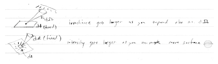 Radiance는 2차 미분이다: 단위 Solid angle 당 Irradiance 혹은 Radiant exitance 이다. 혹은 단위면적 당 Intensity 이다.