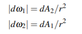 dA1와 dA2를 차례로 통과하는 모든 광자는 이 직선 세트를 따라 이동합니다. 각각의 도착점에서 Radiance를 측정하기 위해서 우리는 Solid Angle을 선택해야 합니다. 반대쪽의 표면을 통과하는 모든 방향과 정확히 일치하는 Solid Angle을 고르는 것이 요령입니다. 우리는 dA1에서 dA2로 대응되는 Solid Angle 로서 dω1을 정의합니다. 비슷하게 dω2는 dA2에서 dA1으로 대응되는 Solid Angle 선택합니다. (아마 이 Solid Angle은 표면위의 각각의 점들마다 다를 거라는 것을 눈치 챘을 겁니다. 이것은 작은 영역이라는 제한안에서는 모든 Solid Angle이 동일하기 때문에 괜찮습니다.) Solid Angle의 크기는 아래와 같습니다.