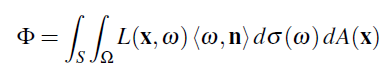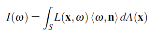 <ω,n>는 ω 에 수직이 아닌 표면을 사용할 수 있게 해주는 코사인 요소 입니다. dσ(ω) 는 다음을 의미합니다. 적분변수(the integration variable)는 ω 이며 우리가 사용하는 측도(the measure)는 σ입니다 , 구의 방향으로 측정한 Solid angle을 내가 부르는 이름. 비슷하게 dA(x)에서 x는 적분변수고 면적은 측도이다. 적분도메인 Ω은 표면 Normal n에 내적을 한 결과가 양수인 결과가 나오는 방향에 해당하는 반구 입니다.(역주 : 그냥 표면의 앞쪽이란 뜻임), 그리고 우리는 ω 방향에 대한 Radiance를 적분 합니다. 왜냐하면 우리는 표면을 떠나고 있는 Radiance에 관심이 있기 때문입니다. L(x,–ω) 을 적분하게 되면 표면위에 들어오는 총 Power를 얻을 수 있습니다.