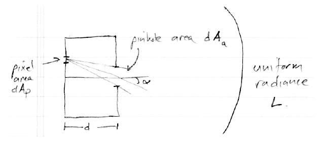 아주 평평한 상자를 생각해보면(상단의 중앙에 핀홀이 있는 셔츠박스를 말함), Irradiance는 균일하지 않다는 것이 명백합니다: 핀홀에 가까울 수록 더 밝아지고 더 멀어질 수록 어두워집니다. 게다가 그것은 방사상 대칭(Radially symmetric)이어야 합니다. 그래서 Irradiance 는 빛이 필름을 때리는 각도 함수입니다; 이것을 α 라 부릅니다. 핀홀로부터 필름까지 떨어진 거리 d라 부르며, 조리개의 면적 dAa라 부릅니다.