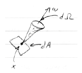 "주위"의 세부적인 의미가 이 정의의 핵심입니다-이것은 기하학적인 질문입니다. Radiance는 Radiant flux를 측정합니다. 이 Radiant flux는 우리가 광자를 바라보아 모아진 것이다. 이 광자는 그것의 방향이 ω방향 주위의 Solid angle dw 이고 표면위에 x위치의 dA 면적이 방향 ω에 수직으로 향하고 있는 광자이다.