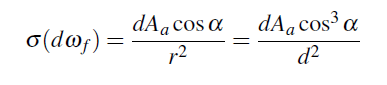 이것을 할수 있는 2가지는 방법은 다음과 같습니다. (dAʹcos θ)를 그룹 지어주는 것과 그것을 “ω 방향으로 dAʹ에 투영되어진 면적” 또는 (dω cos θ)를 그룹 지어주는 것과 그것을 “투영되어진 Solid angle”이라고 부르는 것입니다.