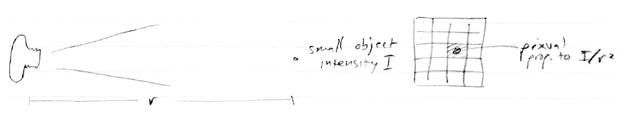 만약 한픽셀에 물체가 모두 들어갈 수 있게 하기 위해서 물체가 작거나 그리고/또는 멀다면(작은 물방울, 별, 기타 등등), 그때는 조금 다르게 행동합니다. 픽셀값으로 부터의 Radiance를 이야기할 수 없습니다. 그리고 픽셀값은 거리가 달라도 같지 않습니다. 대신에, 그 값은 물체의 Intensity와 관련되어 있습니다, Radiance가 아님, 그리고 그것은 거리의 제곱에 따라 감쇄합니다: