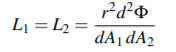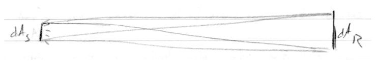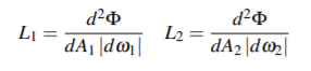 이제 d^2Φ를 두 표면 사이의 flux로 두겠습니다. - 이것은 dA1을 통과한 다음 dA2를 통과하는 모든 입자들이 옮기는 에너지 입니다. 우리가 Radiance 측정을 위해서 Solid Angle을 선택한 방식 때문에 d^2Φ는 양쪽 끝의 Radiance를 측정하는 사용되는 Power 가 됩니다: