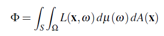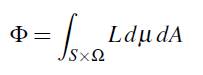 그것 자체의 정의로 부터, 모든 면적과 Solid angle에 대한 적분을 적용한 Radiance로 부터 Power를 얻을 수 있다는 것은 명확합니다. 예를들어 총 표면 S에 존재하는 총 Power는 다음과 같습니다: