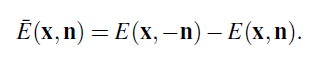 때때로 공간에서 더 자연스러운 표면 Irradiance의 변종은 net Irradiance 입니다. (이것은 내가 쓰는 용어임: 나는 이것을 표준적으로 어떻게 부르는지 모름) Net Irradiance는 Irradiance와 같지만 표면의 두면의 입자를 계산합니다. 그리고 입자들이 통과하는 방향에 따라서 양성과 음성 입자로 계산합니다. 당신은 Net Irradiance를 마치 마법처럼 날아다니는 입자를 계산하는 작은 링 모양의 탐지기로 생각할 수 있습니다. 나는 표면의 Normal 방향으로 이동하는 입자들을 양성으로 계산하는 방식을 사용할 것이고 반대로 이동하는 것을 음성으로 계산할 것입니다. 이것은 Net Irradiance ¯E (x,n) 그리고 기존표면의 Irradiance E(x, n)의 관계는 아래와 같다는 의미 입니다.