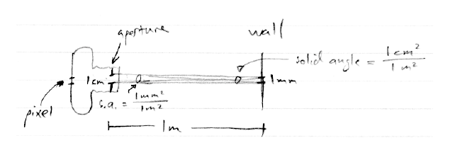 만약 우리가 1km 떨어진 산중턱을 창문을 통해 카메라로 바라보면, 픽셀은 1 m^2 의 면적에 매핑되지만 산으로 부터 카메라의 Solid angle은 10^(-10) sr 입니다. 그리고 만약 산이 벽과 같은 Radiance라면 우리는 카메라로 들어오는 같은 Power 를 얻을 것입니다.