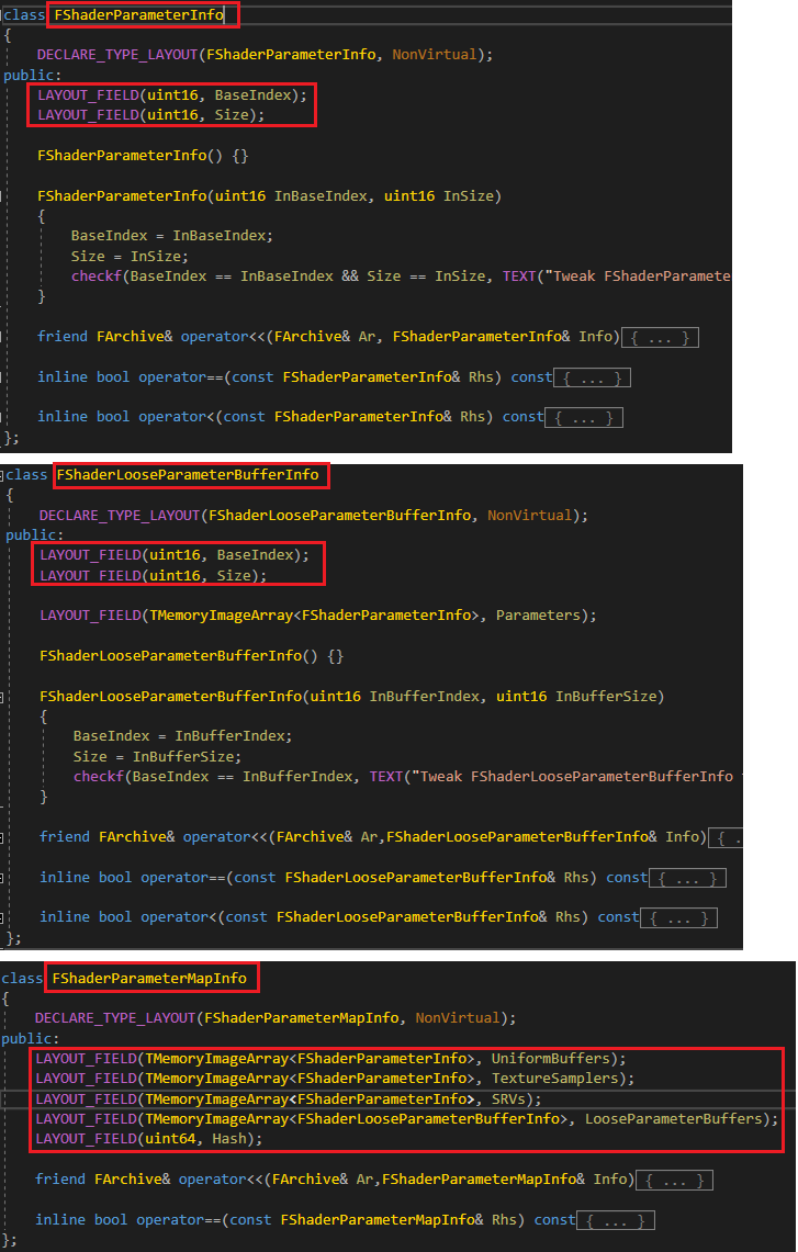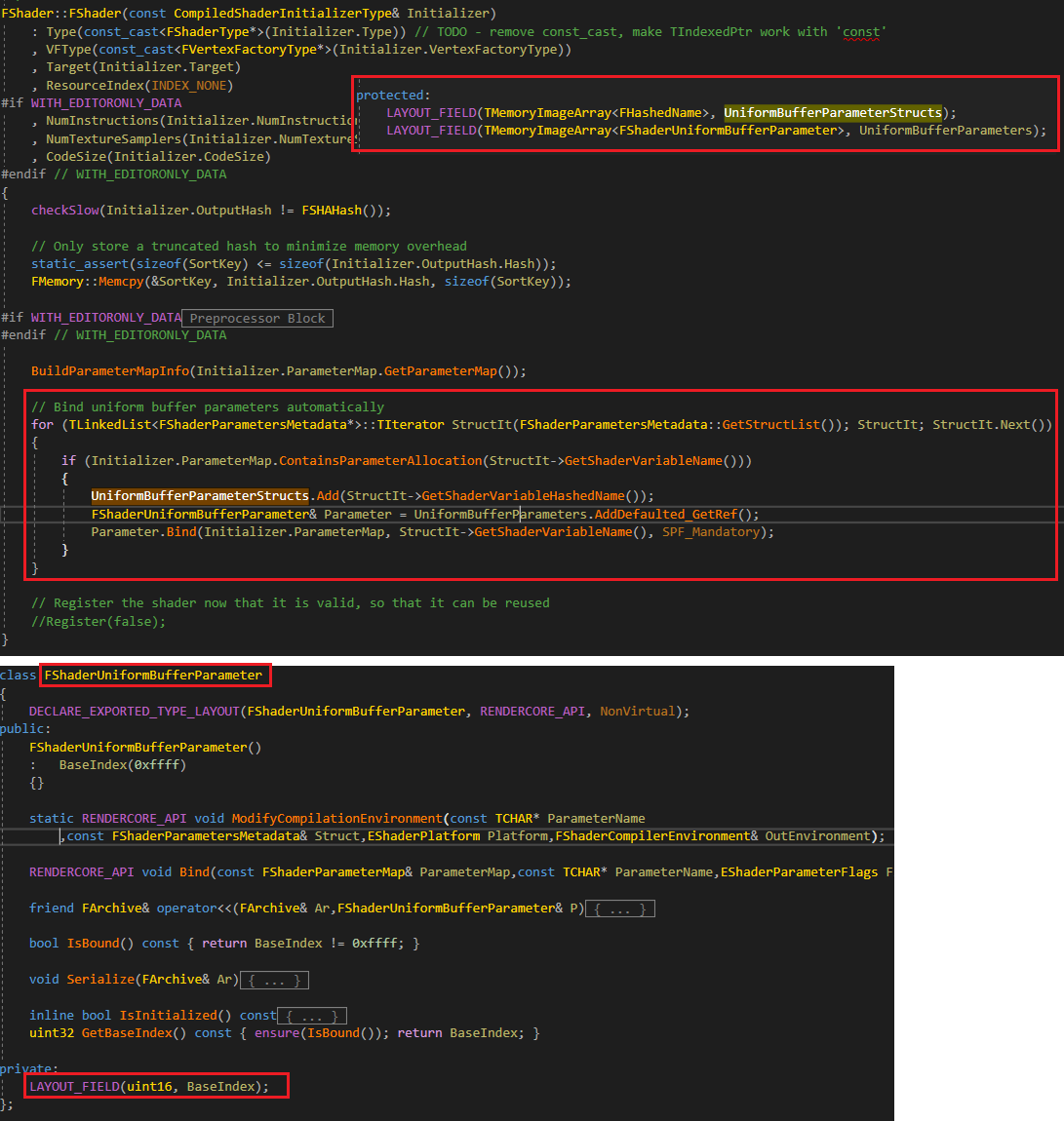 계속해서, UniformBuffer의 경우 FShader 생성자의 별도 코드에서 모읍니다. UniformBufferParameterStrucs에는 사용하는 UniformBuffer의 해시를 저장하고, UniformBufferParamterStructs에 대응하는 UniformBufferParameters의 인덱스 위치에 UniformBuffer의 바인딩 포인트를 저장합니다.