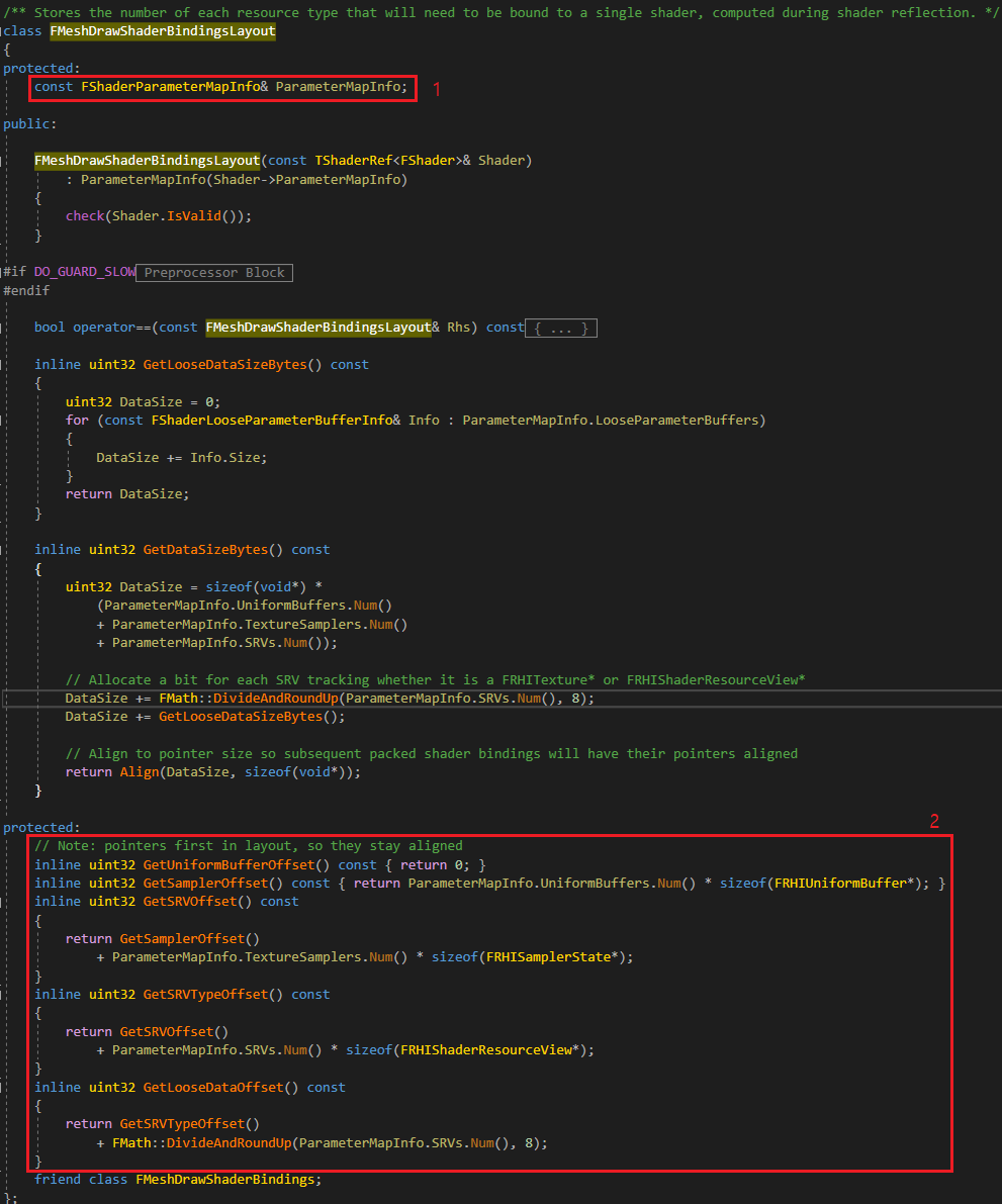 먼저 FMeshDrawShaderBindingsLayout을 봅시다. 이 클래스는 생성자에 FShader를 입력받습니다 그리고 FShader의 리플렉션 정보인 ParameterMapInfo를 가져옵니다. 이 클래스는 메모리 주소 0을 기반으로 UniformBuffer, Sampler, SRV 등의 Offset을 얻을 수 있습니다. 이 클래스의 특징은 0 메모리 주소를 기준으로 UniformBuffer, SRV, Texture 등등의 Offset 값을 얻을 수 있습니다.