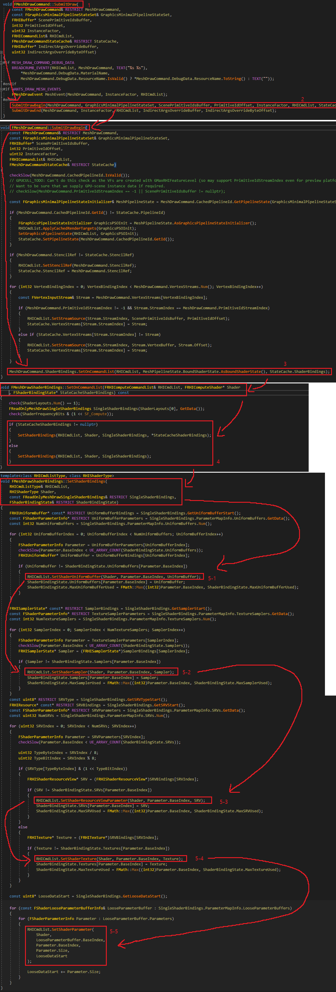 2. FMeshDrawCommand 에서 렌더링 직전에 자신이 갖고 있는 모든 쉐이더의 RHI 리소스(UnfiormBuffer와 리소스들)를 실제 Grpahics API 에 바인딩해달라고 요청하는 함수입니다.