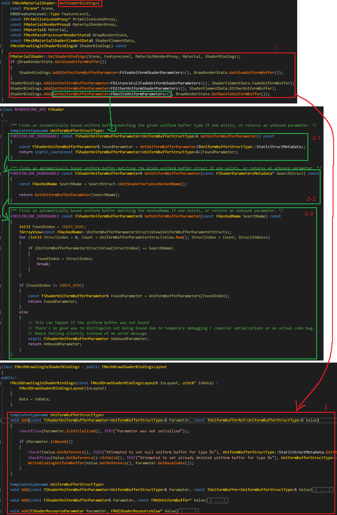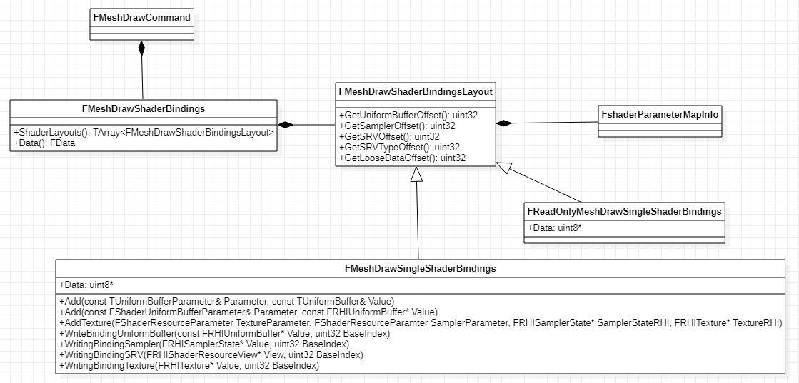 3. FMeshDrawShaderBindings 클래스를 통해 FMeshDrawCommand가 렌더링에 필요한 모든 쉐이더 별 RHI 리소스(UniformBuffer와 리소스)들을 바인딩할 수 있습니다.