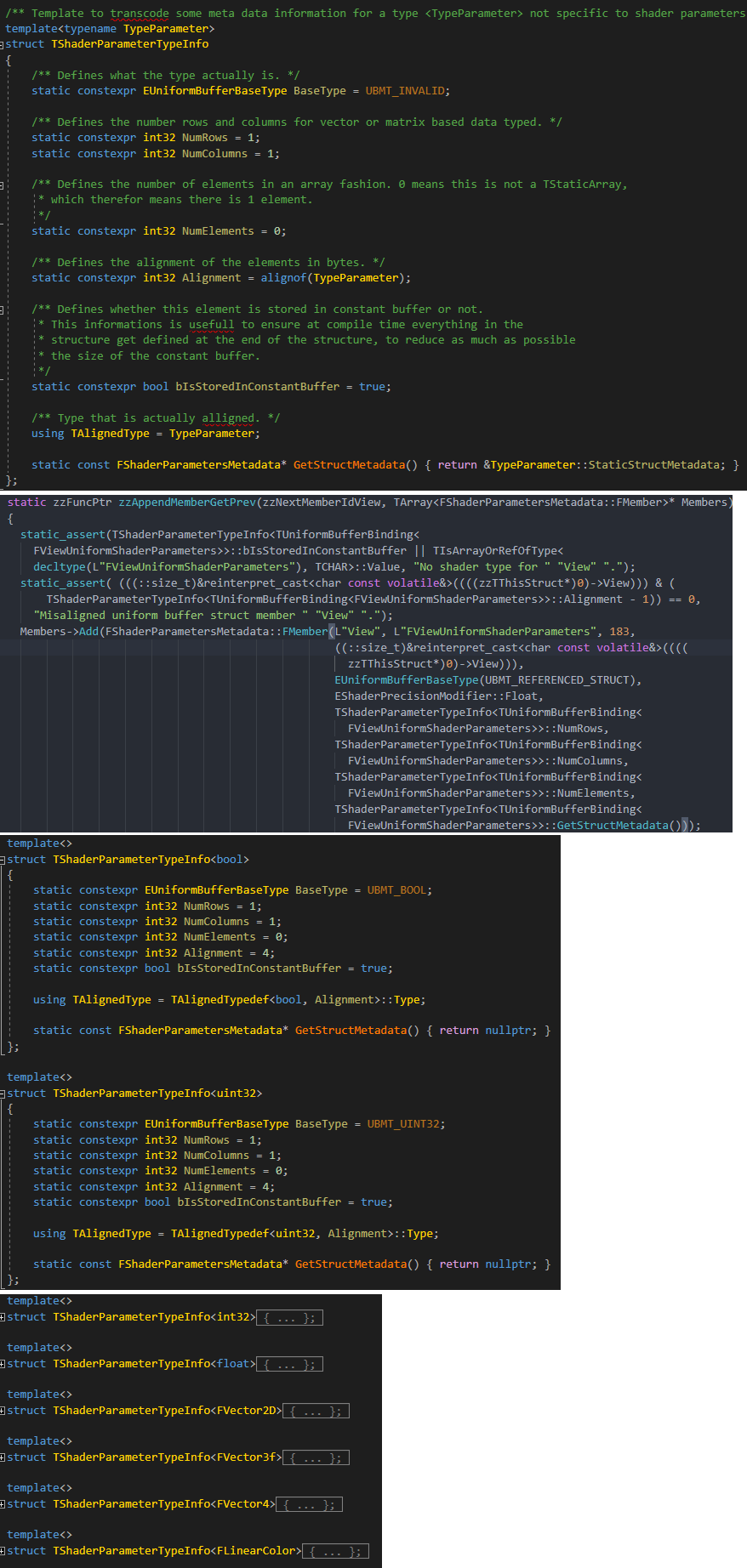 UniformBuffer를 정의하고 나면 이 UniformBuffer가 또 다른 UniformBuffer의 멤버가 될 수 있습니다. 이 말은 이 UniformBuffer의 리플렉션 정보를 만들 수 있어야 된다는 의미입니다. 이런 타입 정보는 아래 그림2를 사용하여 얻어올 수 있습니다. 그리고 기본 데이터 타입 또한 TShaderParameterTypeInfo로 미리 정의되어있는 것을 볼 수 있습니다.