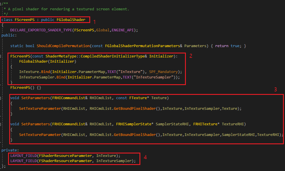 1. FScreenPS 라는 FShader 입니다. 이 쉐이더는 Texture와 TextureSampler 리소스를 추가로 사용합니다.