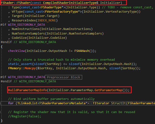 ParameterMapInfo는 FShader의 생성자에서 FShader::BuildParameterMapInfo를 호출하여 구성됩니다.