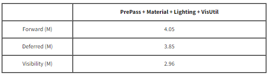 아주 많은 삼각형 수에서, 각 픽셀은 4번 수행됩니다, Visibility 렌더링이 확실히 승자입니다. 디퍼드의 비용은 6.43ms 인데 비해 Visibility는 4.34ms 입니다. 관련 패스에 대한 전체 GPU 비용 32.5%의 감소는 사소한 것이 아닙니다.