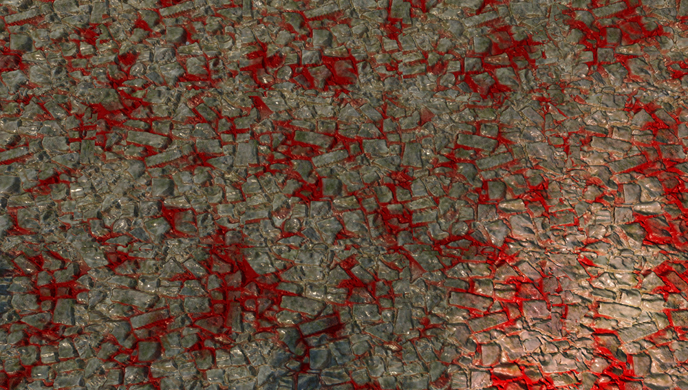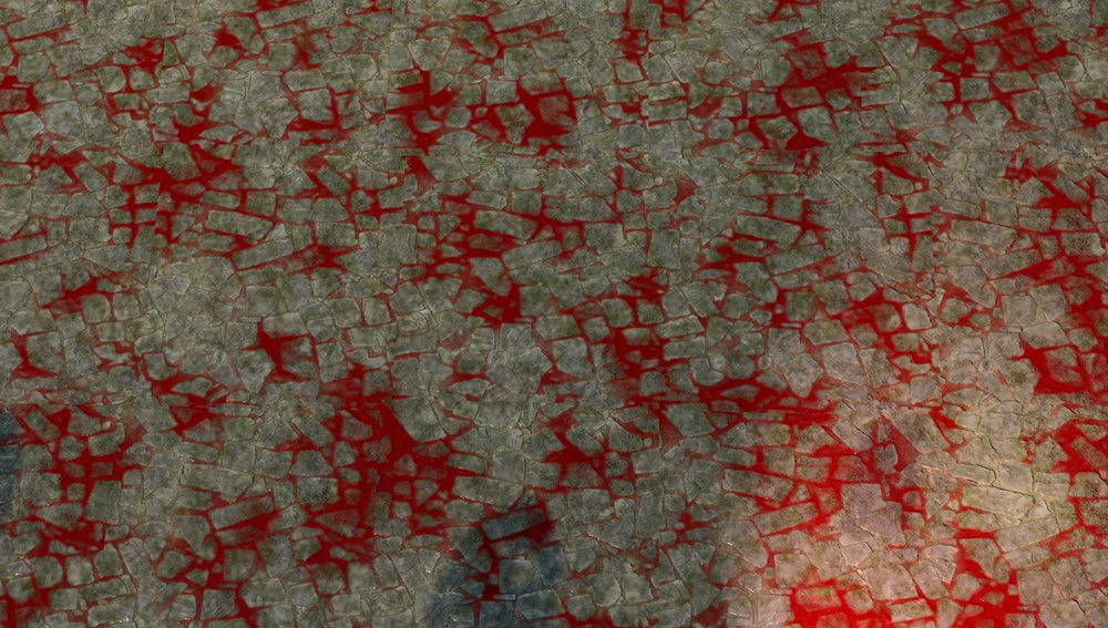 블랜딩을 위해서, 나는 펄린 노이즈의 3 옥타브를 사용합니다(I used 3 octaves of Perlin noise). 나는 또한 내가 원래 계획했던 축축한 층 또한 만들었습니다. 그러나 나의 첫 번째 테스트는 flat red 였습니다, 그것은 멋진 마른 분말 모습이었기 때문에 그것은 선택했습니다. 나는 펄린 노이즈의 한 개의 옥타브를 heightmap과 조합하여 빨간 층이 돌들 사이에 틈에 더 편향(biased)됩니다.