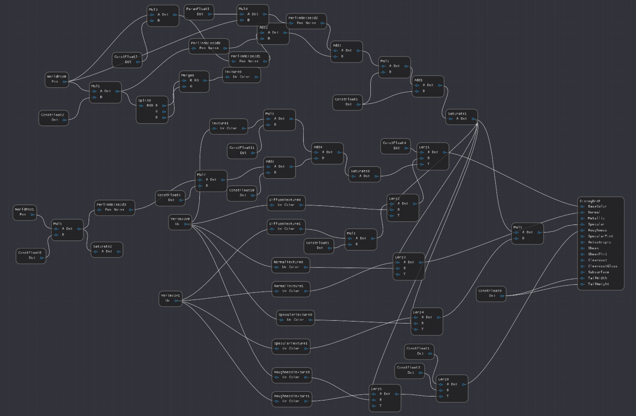 여기는 머터리얼 그래프의 스크린샷입니다. 약간 복잡합니다, 이 머터리얼 에디터가 상용엔진의 적절한 UI 기능보다 대부분(전부?) 부족하기 때문입니다. 나는 노드에 상수를 추가해본 적이 없기 때문에 많은 추가 노드가 있습니다 (0.5를 추가하는 것은 add 노드 그리고 0.5 상수 노드 둘 다 요구합니다). 그러나 이것은 테스트를 위해서는 충분합니다.