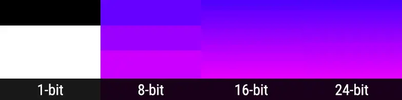 이미지의 color depth는 각 픽셀의 컬러 데이터를 저장하기 위해서 얼마나 많은 메모리가 사용되는지 나타냅니다. 만약 이미지가 8-bit color depth면, 각 픽셀의 컬러 값은 8 비트의 데이터에 저장됩니다. 이 정보는 보통(항상 그렇진 않음) 조합되어 최종 컬러를 생성하는 여러 컬러 채널에 퍼져있습니다. 8-bit 이지미의 경우, 3 비트는 빨강 채널, 3비트는 녹색 채널, 2비트는 파랑 채널에 있습니다.