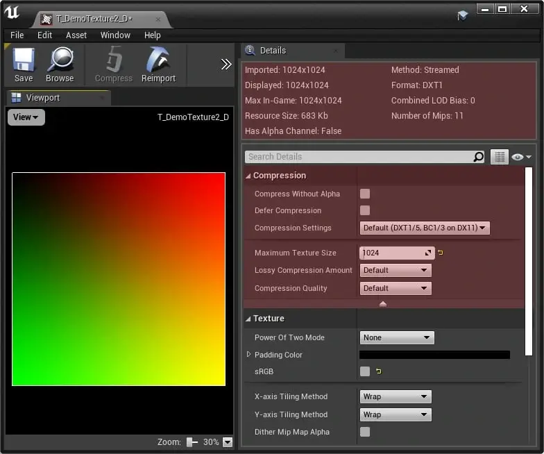 디테일 패널의 가장 위에서 당신의 텍스쳐 해상도의 개요를 볼 수 있습니다, 디스크에서 크기, 스트리밍 방식, 압축 포맷 그리고 밉맵 정보. 우리가 실험한 서로 다른 압축방식에서, 반영된 변화를 여기서 볼 수 있습니다, 그래서 우리는 이 개요를 보러 자주 다시 올 것입니다.