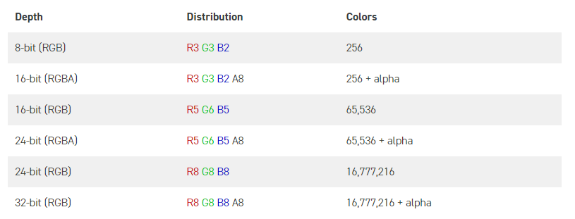 Color/Bit depth는 메모리에서의 전체적인 크기뿐만 아니라 텍스쳐의 컬러 범위를 정의합니다. 아래의 테이블은 이 가이드의 나머지 부분에서 참고할 더 일반적인 color depth formats를 담고 있습니다.