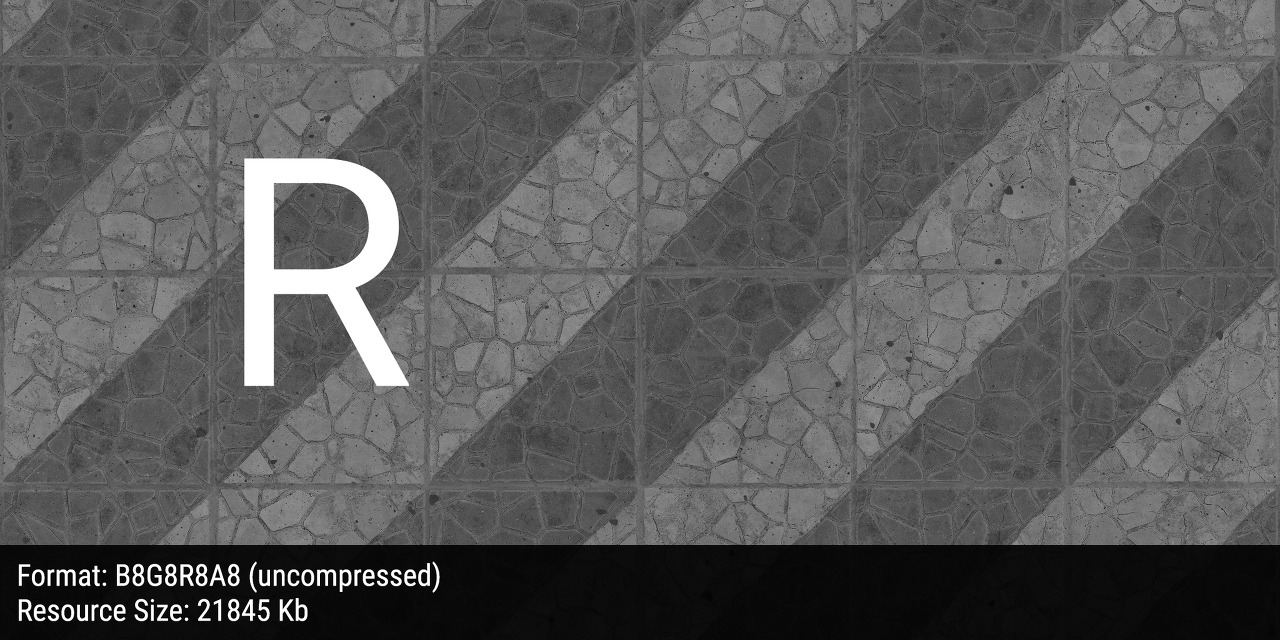 Grayscale 은 sRGB 또한 지원합니다, 그러나 만약 활성화한다면 프로파일은 비압축 포맷 B8G8R8A8 이라 불리는 포맷으로 전환됩니다, 그래서 당신의 이미지는 동일한 네 개의 채널이 있는 32 비트 RGBA 이미지로 변환됩니다. 당신이 예상한 데로, 이것은 아주 크게 당신의 텍스쳐 크기를 증가시킵니다. 나는 당신이 이것이 필요하지 않을 것이라 생각합니다.