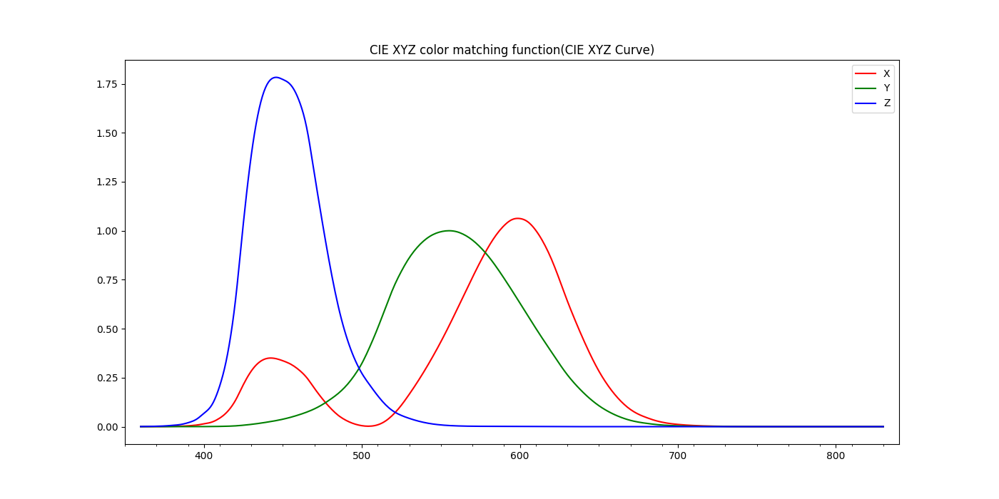 , [CIE_XYZ_Curve.CIE_X[i], CIE_XYZ_Curve.CIE_Y[i], CIE_XYZ_Curve.CIE_Z[i]])