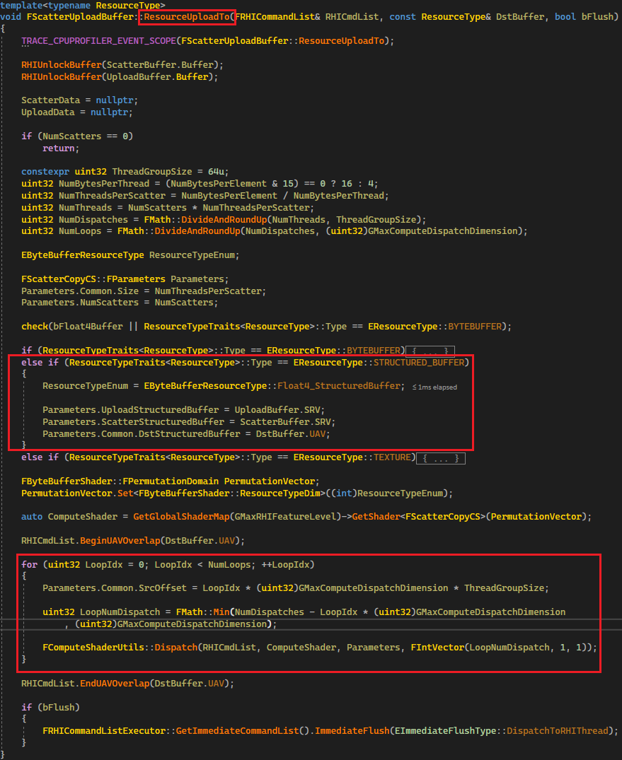 5. 업로드 방식은 총 2가지입니다. ComputeShader를 통해 업로드하기 때문에 ComputeShader가 사용할 수 있는 최대 Group 크기를 고려합니다. 그래서 만약에 한 번에 업데이트 가능한 경우 이 코드를 실행합니다. PrimitiveUploadBuffer.ResourceUploadTo가 한 번만 불리는 것을 확인할 수 있습니다.
