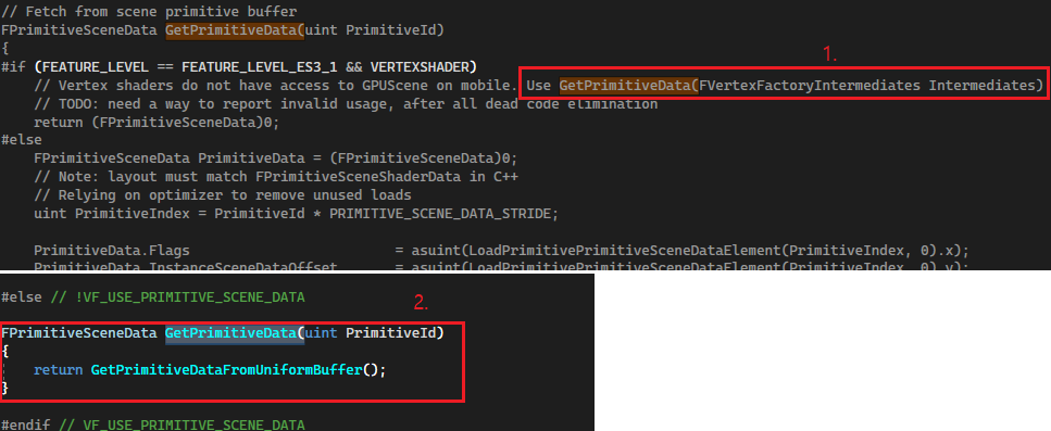 Vertex or Pixel 쉐이더에서 PrimitiveData를 사용할 때는 GetPrimitiveData 함수를 사용합니다. GetPrimitiveData 함수의 선언은 다양한 곳에 있습니다. 아래는 그림3은 그중 MaterialTemplate.ush와 LocalVertexFactory.ush에 선언된 것을 볼 수 있습니다.