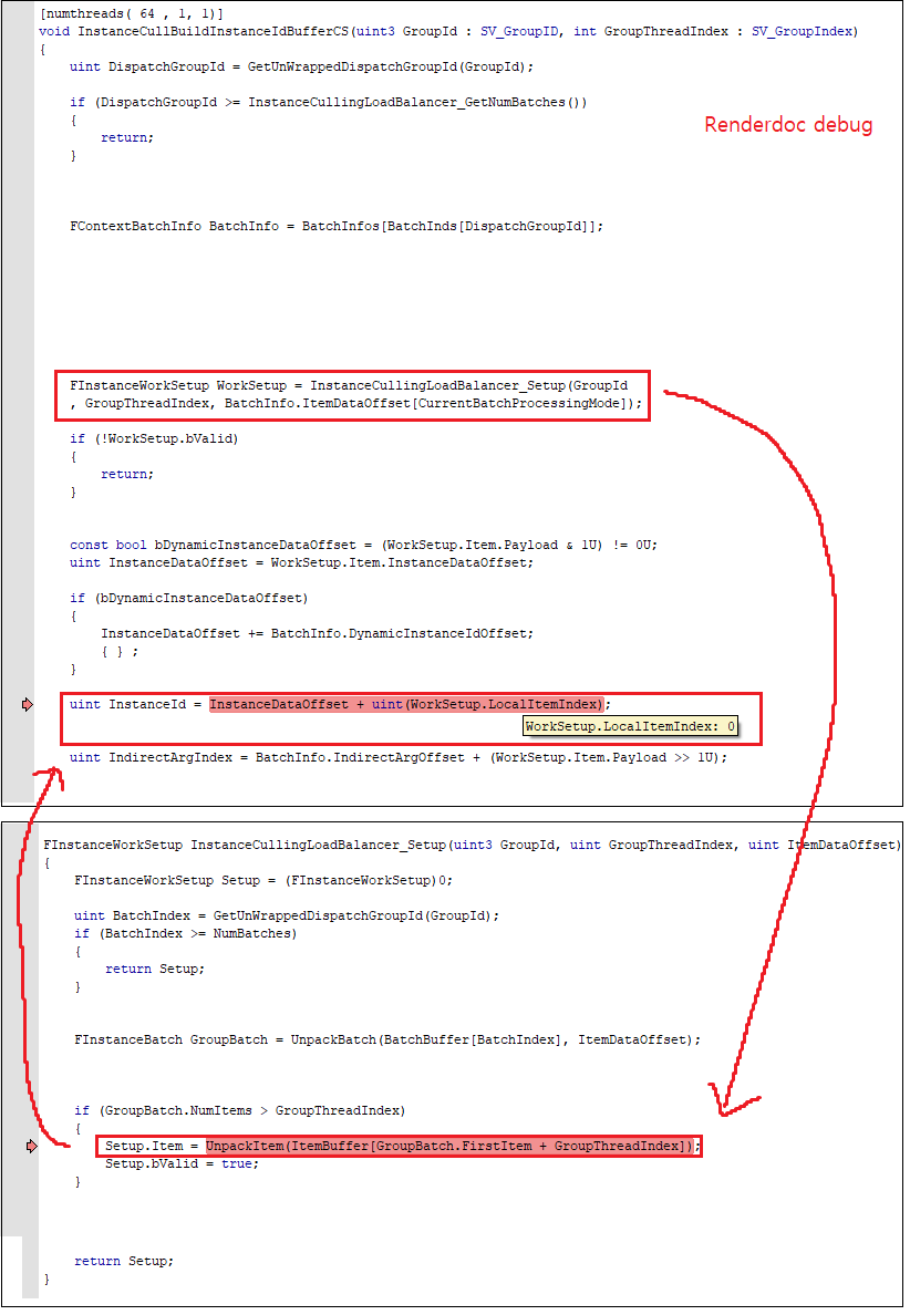 1. InstanceCullingLoadBalacner_Setup 함수는 그림21에서 보듯 Compute Shader에서 가장 먼저 호출됩니다. 그리고 이 함수에서 리턴값 중 가장 중요한것은 Item.InstanceDataOffset 입니다. InstanceDataOffset 은 InstanceId 를 얻는데 사용됩니다.