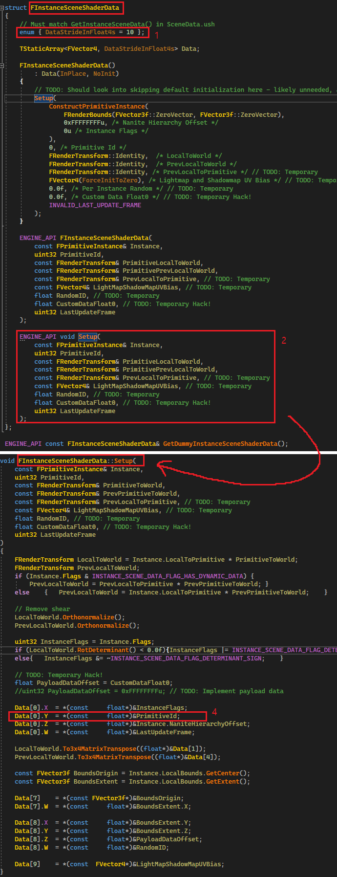 이전 글에서 GPUScene을 사용하는 경우 PrimitiveData를 얻어오는 부분을 보면, PrimitiveId를 이미 어디선가 얻어왔다고 가정하고 설명하고 있습니다. 이 글에서는 GPUScene을 사용할 때 어떻게 PrimitiveId를 얻어올 수 있는지에 대해서 먼저 알아볼 것입니다. 그리고나서 Auto-Instancing에 대해서 알아봅시다.