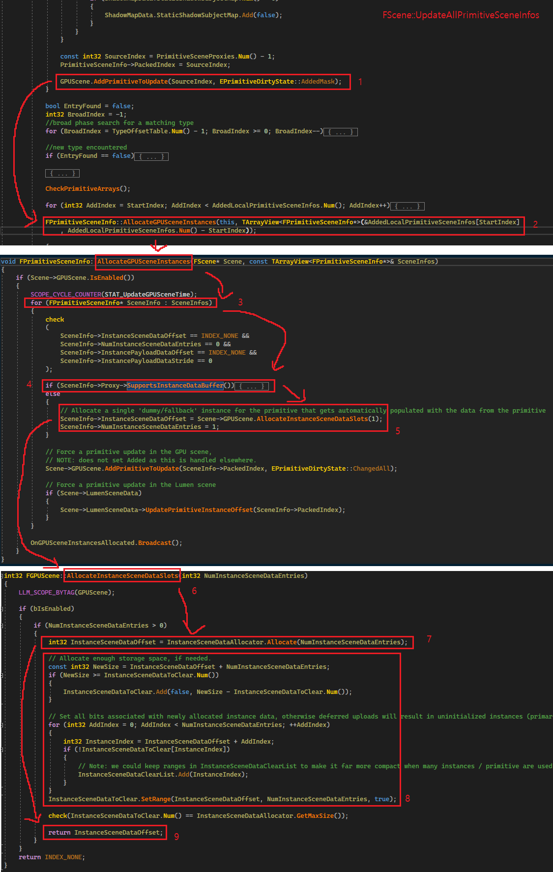 Auto-Instancing에 대해서 알아보기 전에 GPUScene을 사용하여 PrimitiveData를 얻어오는 과정에 대해서 조금 더 알아봅시다. 이전글에서는 GPUScene을 사용하는 경우 이미 PrimitiveId가 어디선가 구해져있다는 것을 가정하고 코드를 봤습니다. 이글에서는 GPUScene이 어떻게 PrimitiveId를 얻어오는지를 확인해봅시다.