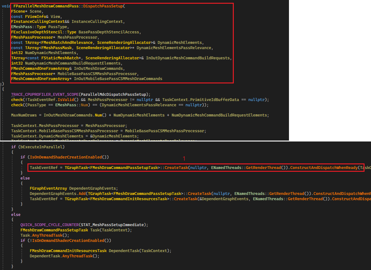 3. WaitForMeshPassSetupTask는 FParallelMeshDrawCommandPass 가 렌더링할 MeshDrawCommand 생성을 수행하고 있는 GraphTask를 기다리는 부분입니다.(레퍼런스4의 FMeshDrawCommandPassSetupTask 를 참고하면 됩니다.)