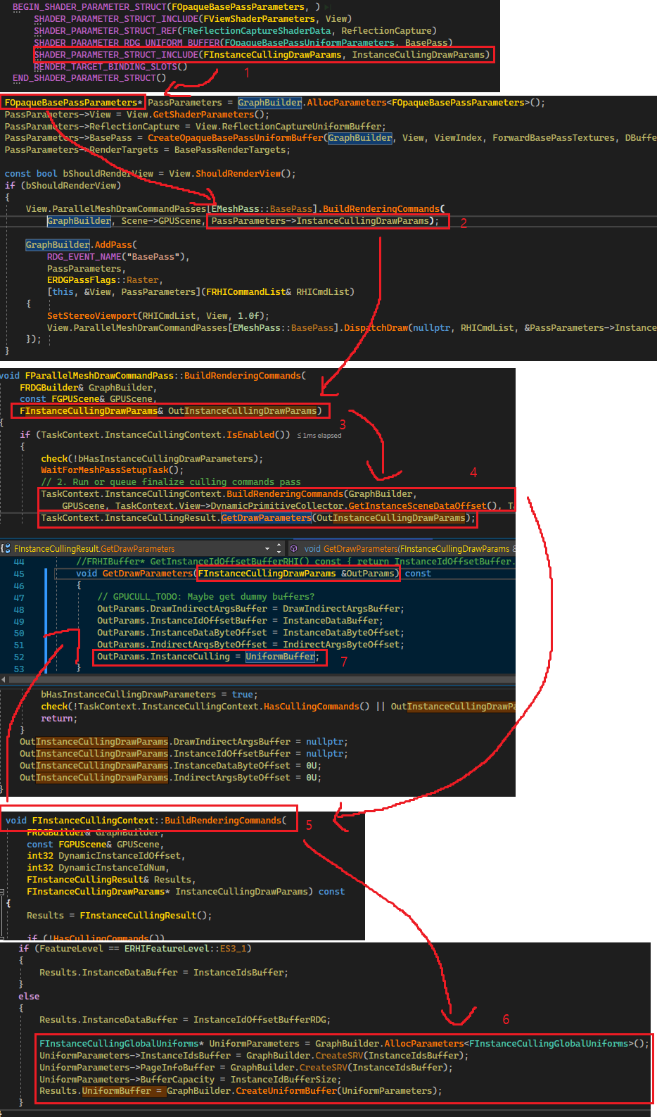 7. InstanceCullingContext의 실행 결과를 FInstanceCullingDrawParams 의 InstanceCulling 에 담아줍니다. 위에서 이야기 했듯 InstanceCulling에 InstanceIdsBuffer가 포함되어있습니다.) 이제 BasePass 파라메터가 바인딩 될때 'UniformBuffer(변수명)' 내부에 있는 InstanceIdsBuffer도 함께 바인딩 될 것입니다.
