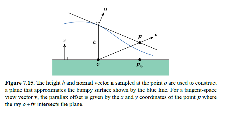 파란색 선이 실제 표면의 돌출된 부분입니다. 그리고 o는 원래 사용하려고 했던 Texture UV 위치입니다. Pxy는 Texture UV에 추가될 Offset UV 입니다. 계속해서 Pxy를 어떻게 구하는지 알아봅시다.