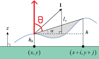 1). 현재 텍셀 위치 (x, y)의 Height H0와 현재 텍셀에서 라이트의 방향의 이웃에 있는 텍셀 (x + i, y + j)의 Height H1를 얻습니다. 이렇게 얻어진 두 Height가 생성하는 벡터와 표면이 이루는 각을 a를 구합니다.