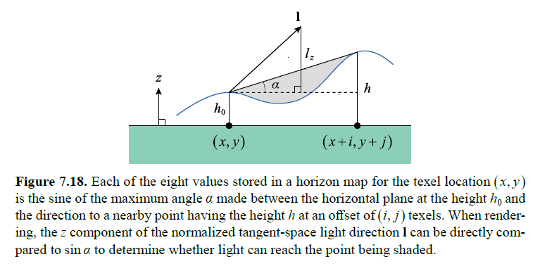 HorizonMap에 저장되는 값은 라디안값이 아니라 sin(a) 값이 저장됩니다. 여기서의 a 는 그림1에서 나오는 두 Height가 생성하는 벡터와 표면이 이루는 각입니다. sin 값은 라디안 값이 커질수록 증가하기 때문에 이 값 자체로 대소 비교가 가능합니다. sin 값으로 저장하게 되면 얻을 수 있는 장점은 표면과 라이트가 이루는 각을 계산할 때(이 각을 b로 둠), 라이트가 정규화되어있다면, 라이트 벡터의 z 컴포넌트가 z / 1 = sin(b) 이기 때문에 바로 대소 비교가 가능하기 때문입니다.