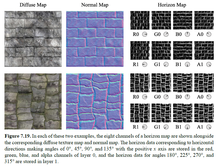 HorizonMap은 360도의 인접 텍셀에 대한 높이 차를 저장하기 위해서 2장으로 구성됩니다. 2장의 텍스쳐는 총 8개의 채널이 있으며 각각은 0, 45, 90, 135, 180, 225, 270, 315 에 대한 높이차를 저장합니다. 그림 2를 보면 2가지 텍스쳐에 대해서 HorizonMap이 어떻게 구성되는지 볼 수 있습니다.