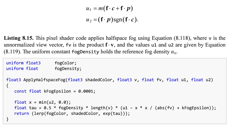 Halfspace fog는 평면을 기준으로 평면의 앞쪽은 Fog가 없고, 뒤쪽은 Fog가 있습니다. 평면과의 거리가 멀어질 수록 Fog가 더 짙어집니다. Halfspace fog의 구현에는 흡수와 산란에서 본 Extinction (Absortion + Out scattering) 과 In scattering 을 고려한 Fog 공식이 포함됩니다. 이 공식 Color = ShadedColor * Extinction + FogColor * (1 - Extinction) 을 사용하여 최종 쉐이딩 컬러를 결정합니다.