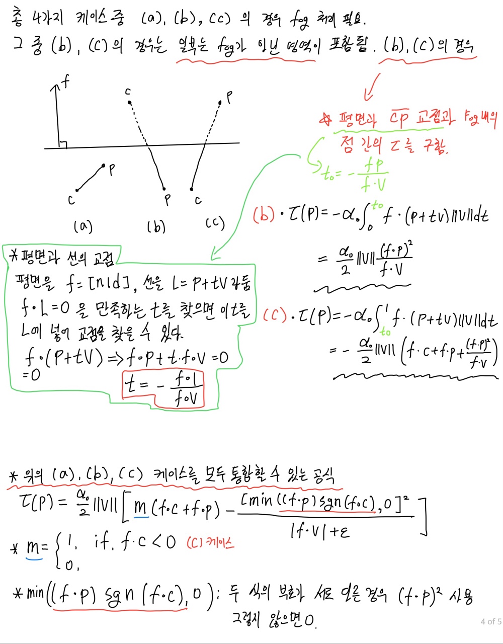 그림2에서 카메라의 위치 C와 렌더링 될 위치 P에 따라서 총 3가지 케이스로 나오는데, C와 P가 모두 Fog 바깥에 있는 경우도 고려할 수 있습니다. 그림2의 통합 공식은 그런 부분 까지 고려되어있습니다. 책에 정리되어 있는 총 4가지 케이스에 대한 공식은 아래와 같습니다.