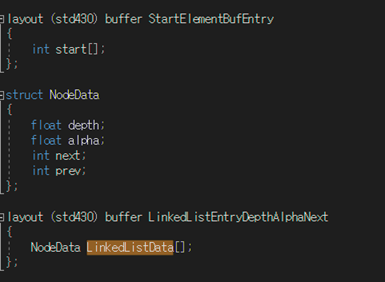 - 링크드리스트 노드를 생성하기 위해서 Atomic Counter를 사용한다. (Fragment Shader는 각각의 Fragment마다 비동기로 작동하므로 새로운 노드를 생성할 때 이 Atomic Conter를 기준으로 해야함)