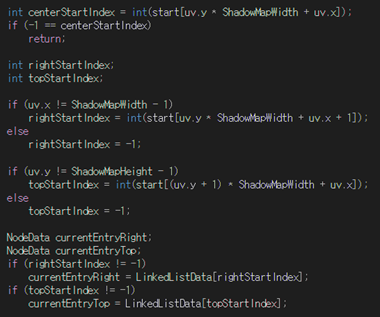 - 나머지 코드는 아래와 같다. ShadowMap의 현재 UV 위치에 새로운 링크드리스트 노드를 추가해준다. 이때 이미 만들어진 노드가 있다면 새로 만든 노드로 교체해주고 이전에 있었던 노드를 Next로 연결한다.