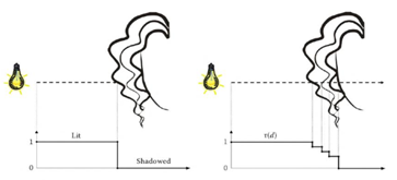 머리카락과 같은 물체에 의해서 차폐되어 그림자가 생기는 경우를 고민해보자. 이 경우 그림자는 즉시 완전히 차폐 되는 것이 아니라 일부 빛은 머리카락을 통과하여 그림자가 서서히 진해지게 된다. DSM을 통해서 이 부분을 표현할 수 있다.