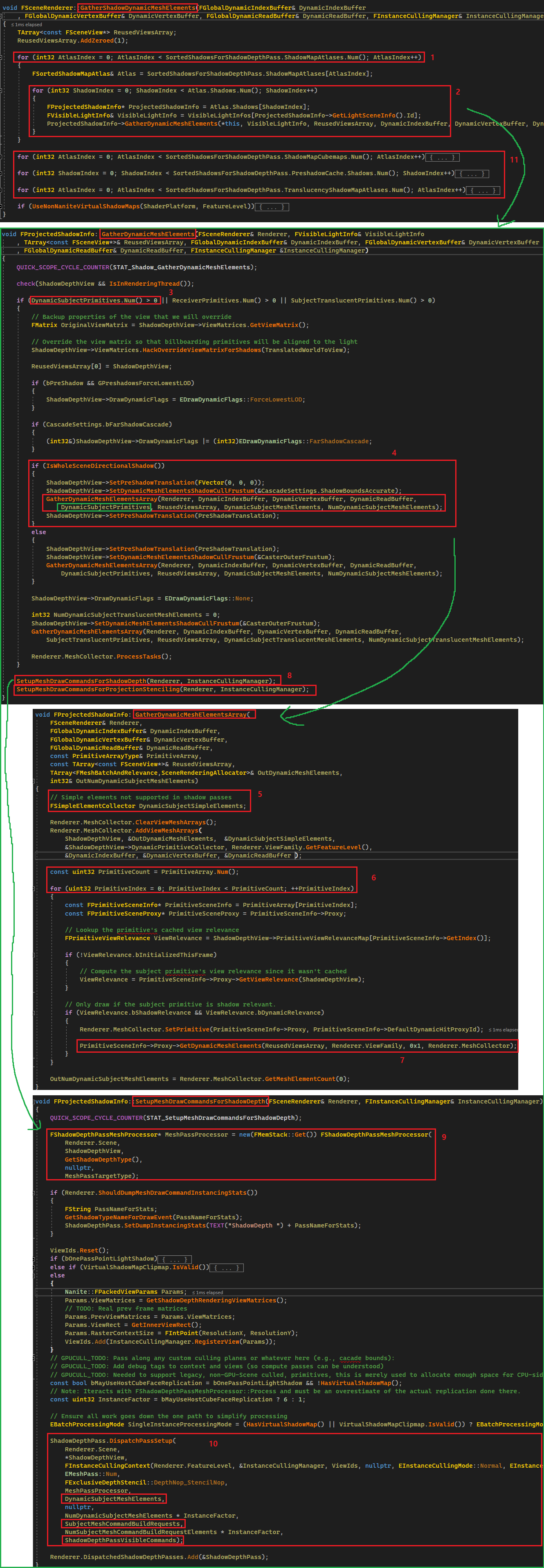 2. Atlas가 가지고 있는 FProjectedShadowInfo들이 MeshBatch를 생성할 수 있게 GatherDynamicMeshElements를 호출합니다. 초록색 화살표를 따라가 함수 내부를 확인해 봅시다.