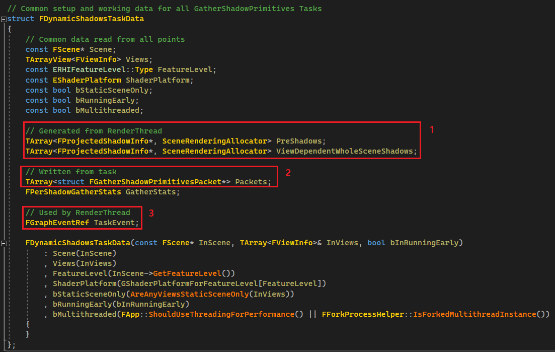다음으로 볼 클래스는 FDynamicShadowsTaskData 입니다. 위에서 InitDynamicShadows 함수를 사용하여 쉐도우맵에 렌더링 할 프리미티브를 모은다고 하였습니다. 그리고 렌더링할 데이터를 모으고 렌더링 할 수 있는 기능을 가진 클래스는 FProjectedShadowInfo 였습니다. 현재 장면 기준으로 렌더링 해야 할 쉐도우들의 FProjectedShadowInfo를 FDynamicShadowsTaskData에서 모읍니다.