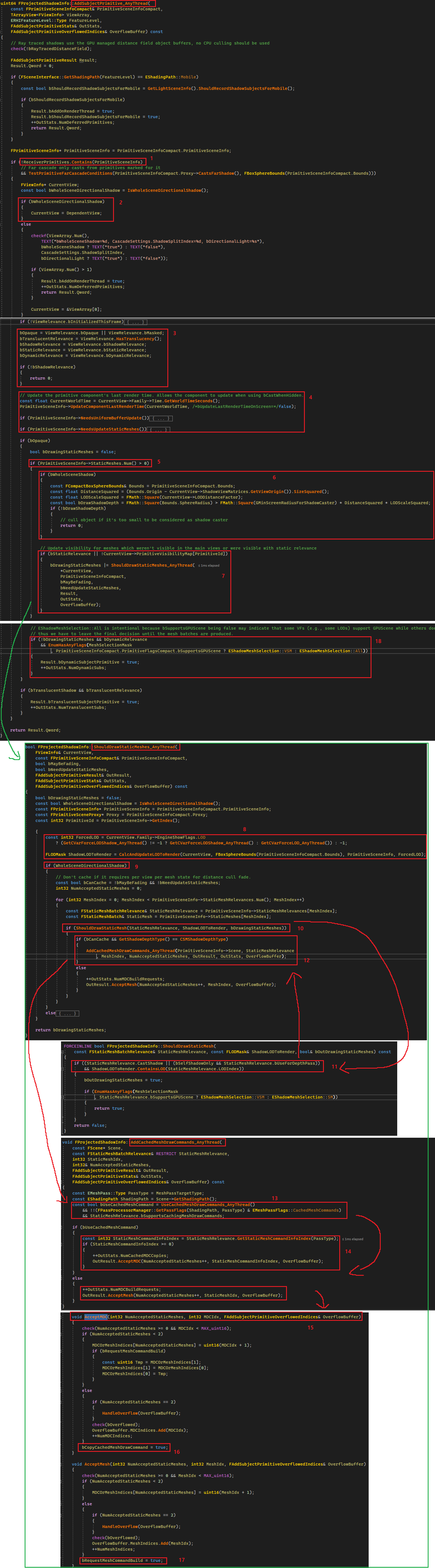 이제 계속해서 FProjectedShadowInfo가 렌더링 할 프리미티브를 추가하는 AddSubjectPrimitive_AnyThread의 구현을 봅시다.