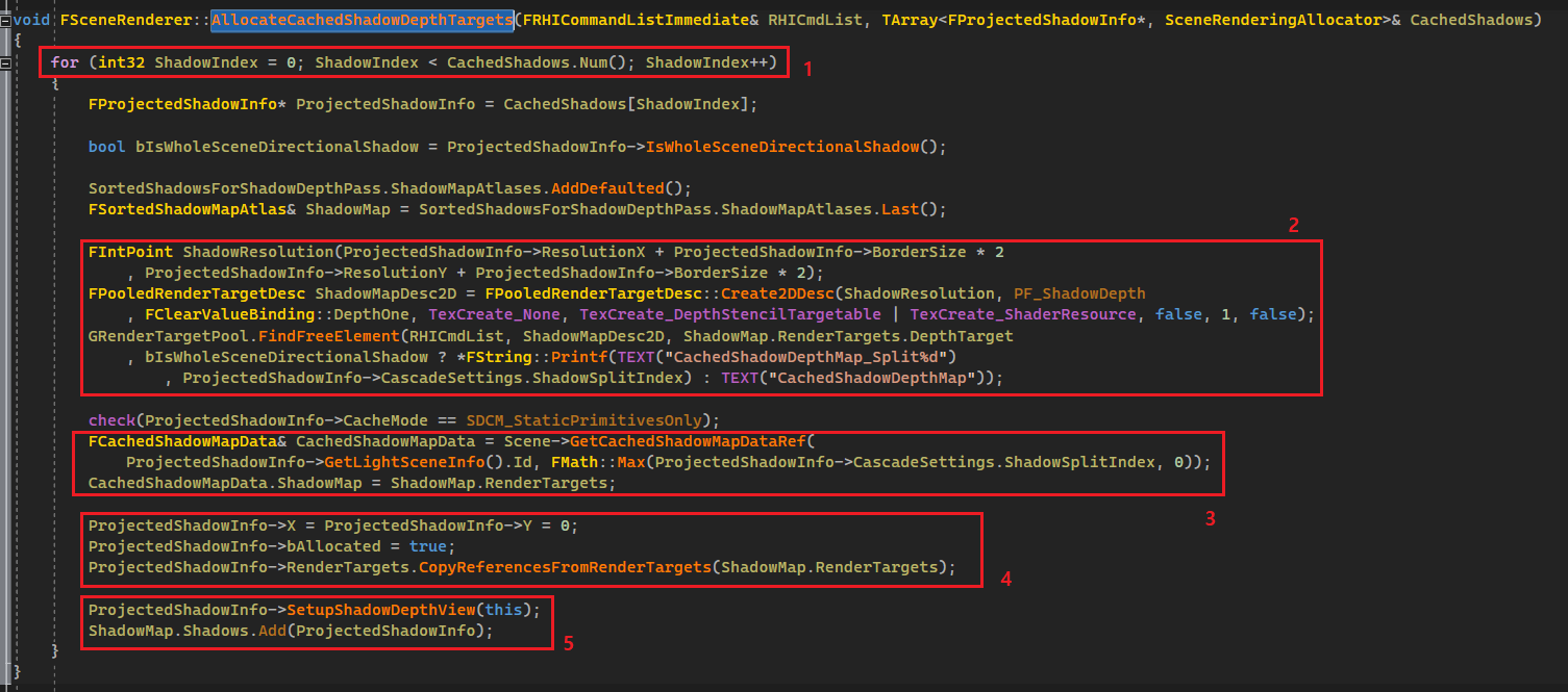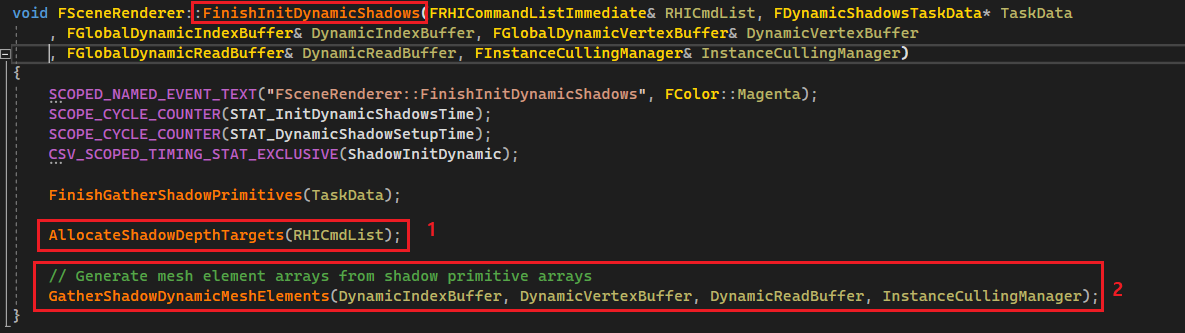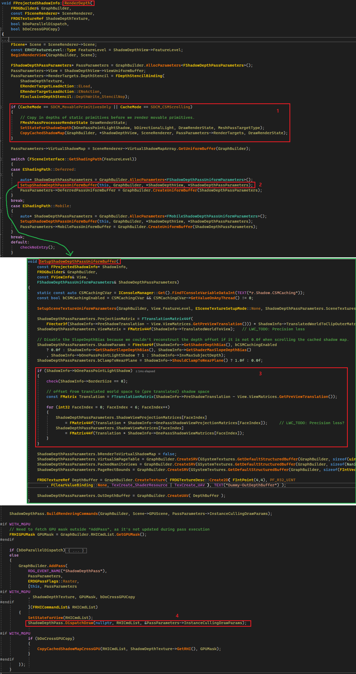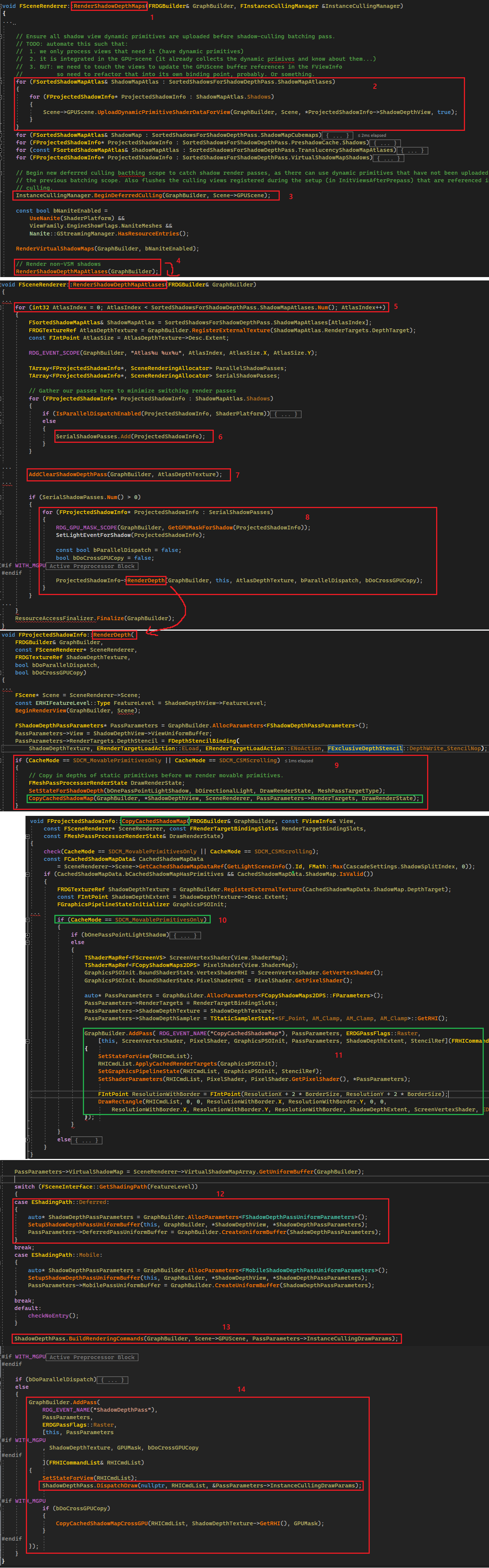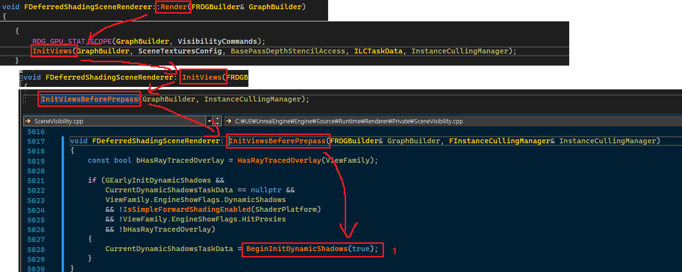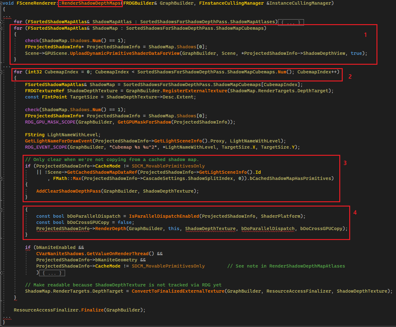 1. RenderShadowDepthMaps 를 호출합니다. 이 함수는 FDeferredShadingSceneRenderer::Render 함수에서 호출됩니다.