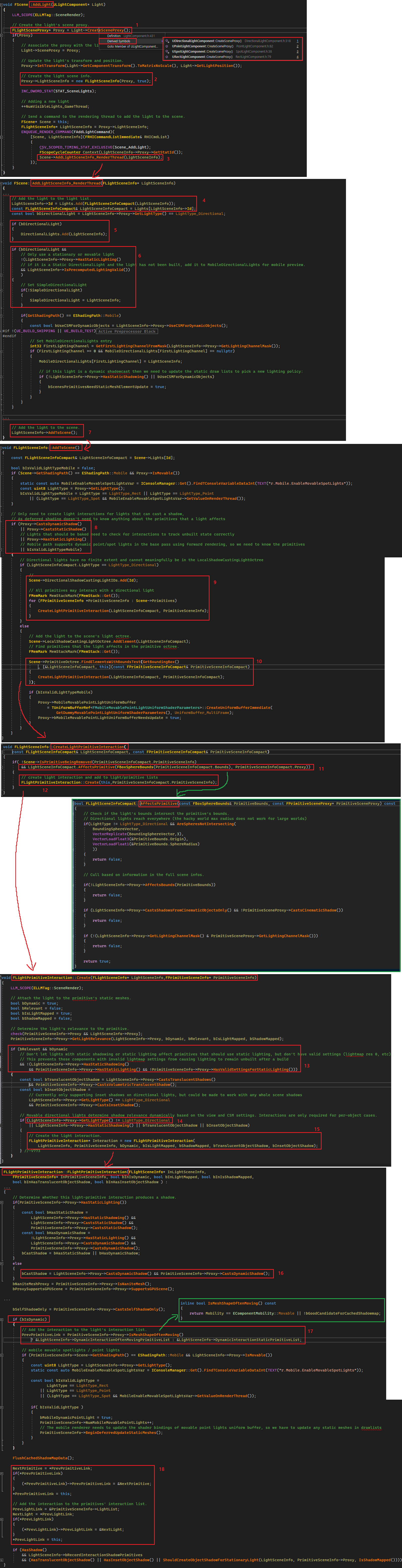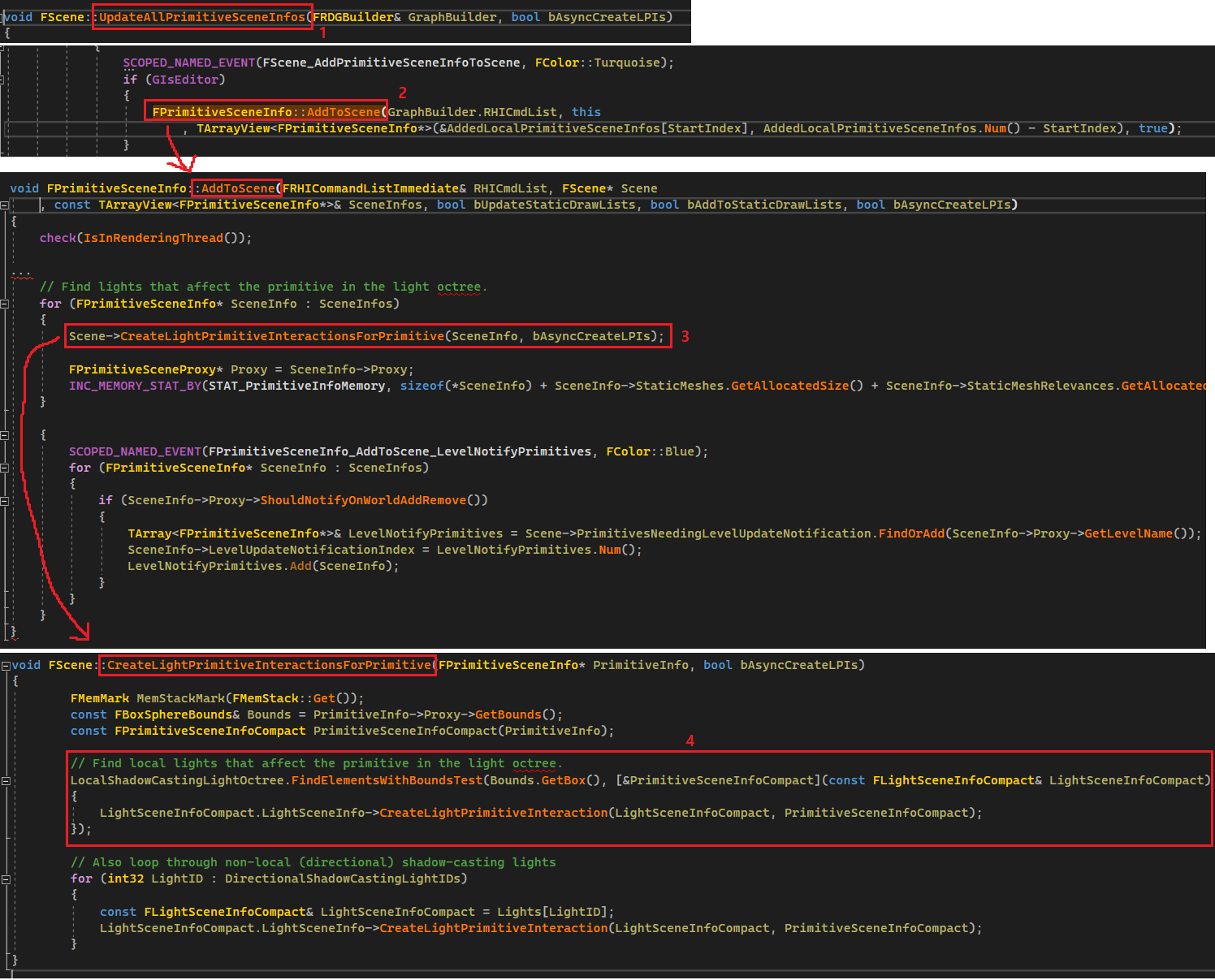 첫 번째로, Spot, Point, Rect light는 쉐도우맵에 렌더링 할 프리미티브를 수집하는 방식이 Directional light와는 다릅니다. 프리미티브를 수집하는 시점은 프리미티브가 FScene에 등록되는 시점에 처리됩니다. 라이트와 라이트가 그려야 할 프리미티브들은 FLightPrimitiveInteraction 클래스를 통해 관계가 형성됩니다. 이 부분을 이해하기 위해서 Light가 렌더스레드에 어떻게 등록되는지와 자신이 렌더링 할 프리미티브들을 어떻게 등록하는지 알아볼 것입니다.