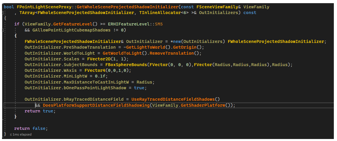 7. 한 프레임에 새로 캐싱할 쉐도우맵의 수가 너무 많은 경우 그냥 이전에 캐시된 쉐도우맵을 사용하도록하고 다음에 업데이트 하도록 하는 로직입니다. bOverBudget 변수가 true 면 쉐도우맵 캐싱 수 제한을 넘은 것으로 볼 수 있습니다. 이는 이번 프레임에 모든 라이트 들을 대상으로 이번 프레임에 캐시 할 쉐도우맵의 수를 모두 더 했을때 일정값 이상 넘어가는지를 비교하는 것입니다. Spot / Point / Rect light 각각 r.Shadow.MaxNumSpotShadowCacheUpdatesPerFrame, r.Shadow.MaxNumPointShadowCacheUpdatesPerFrame 콘솔명령어로 이 부분을 제어할 수 있으며 Rect light는 Point light와 같은 콘솔 명령어를 사용합니다. 이 부분을 잘 활용하면 쉐도우를 캐스팅하는 라이트가 많은 경우 순간적으로 순간적으로 쉐도우맵 캐싱으로 인한 히칭을 방지할 수 있을 것 같습니다.